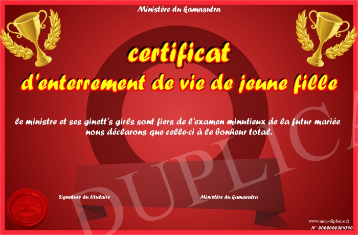 Envoyez par email votre certificat d'enterrement de vie de jeune fille personalisé