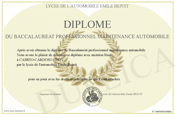 Envoyez par email votre Diplôme du baccalaureat professionnel Maintenance Automobile personalisé