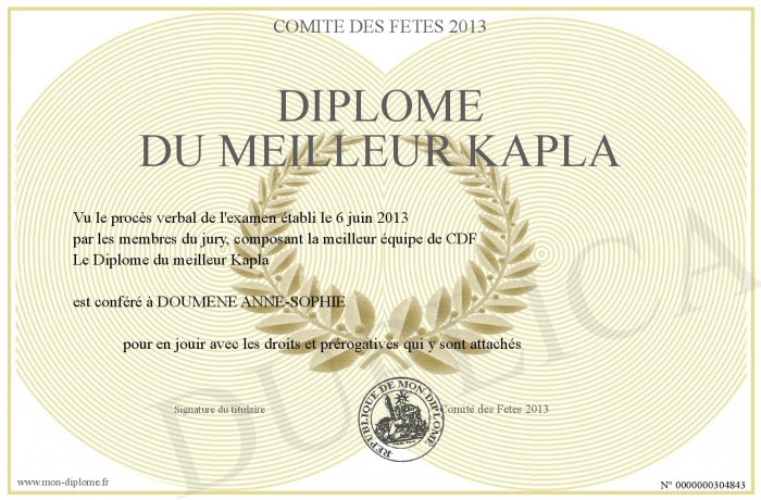 Envoyez par email votre Diplôme du meilleur Kapla personalisé