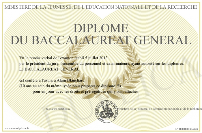 Envoyez par email votre Diplôme du baccalaureat général personalisé