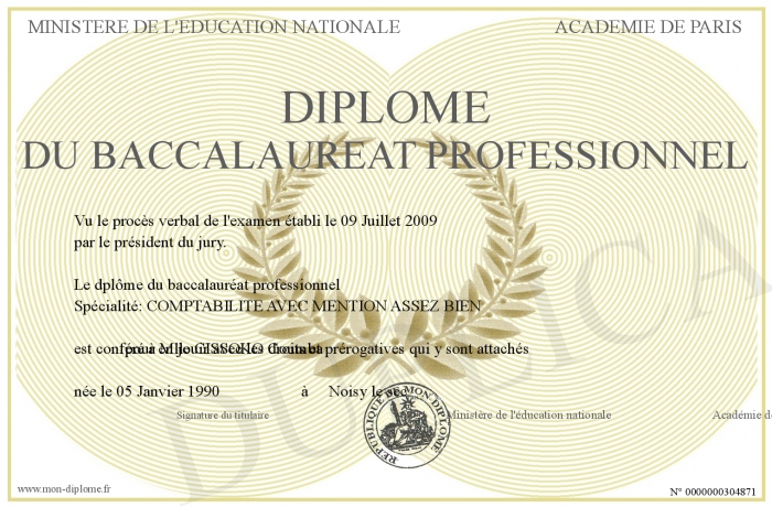 Envoyez par email votre Diplôme du baccalauréat Professionnel personalisé
