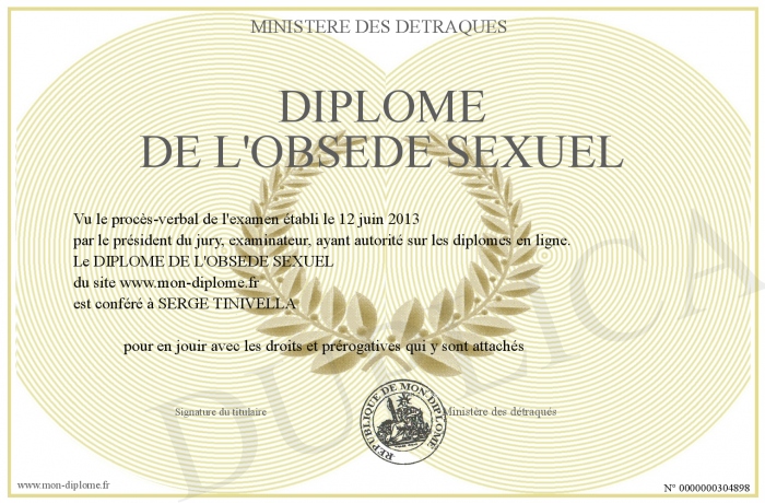 Envoyez par email votre DIPLOME DE L'OBSEDE SEXUEL personalisé