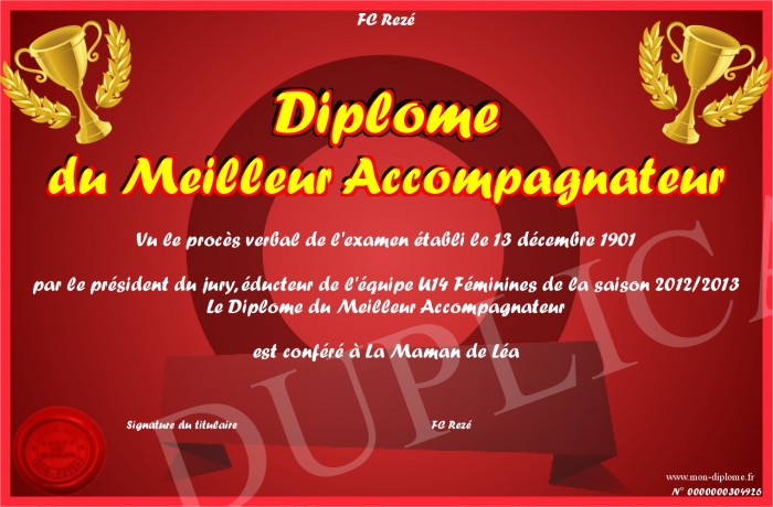 Envoyez par email votre Diplôme du Meilleur Accompagnateur personalisé