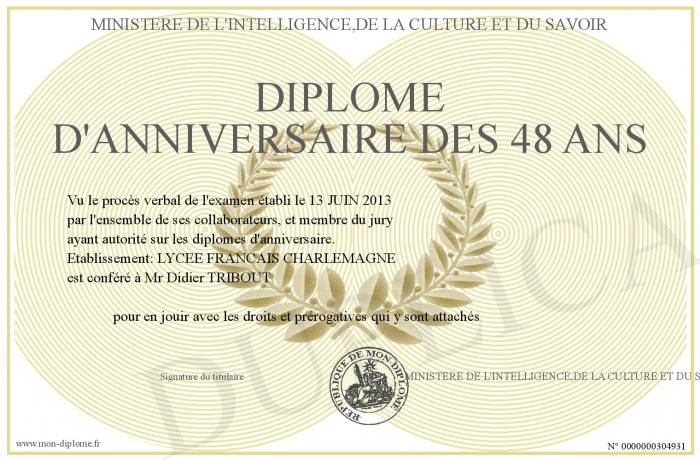 Envoyez par email votre DIPLOME D'ANNIVERSAIRE DES 48 ANS personalisé