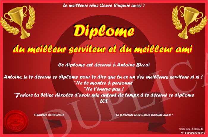 Envoyez par email votre Diplôme du meilleur serviteur et du meilleur ami personalisé