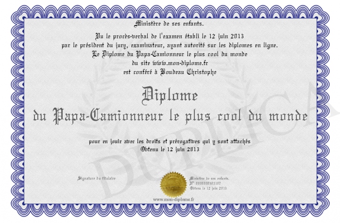 Envoyez par email votre Diplôme du Papa-Camionneur le plus cool du monde personalisé