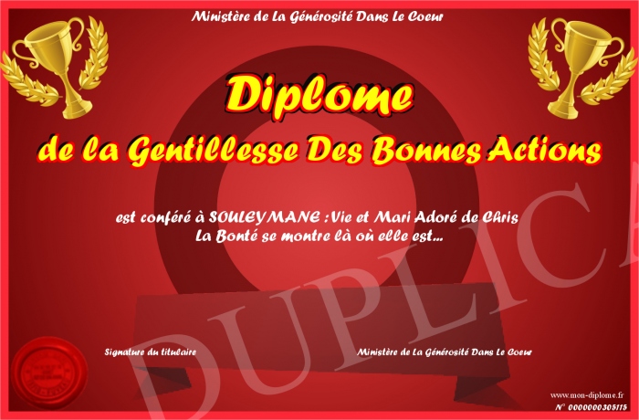 Envoyez par email votre Diplôme de la Gentillesse Des Bonnes Actions personalisé