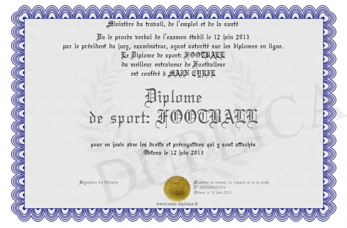 Envoyez par email votre Diplome de sport: FOOTBALL personalisé