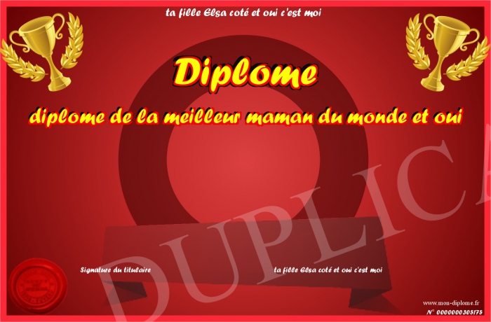 Envoyez par email votre Diplôme diplôme de la meilleur maman du monde et oui personalisé