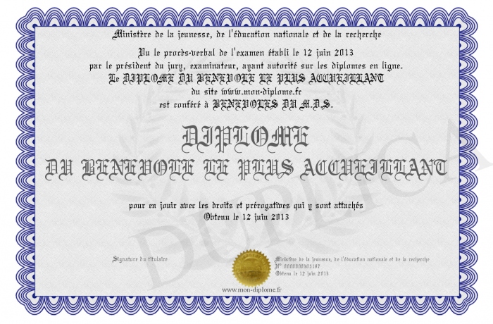 Envoyez par email votre DIPLOME DU BENEVOLE LE PLUS ACCUEILLANT personalisé