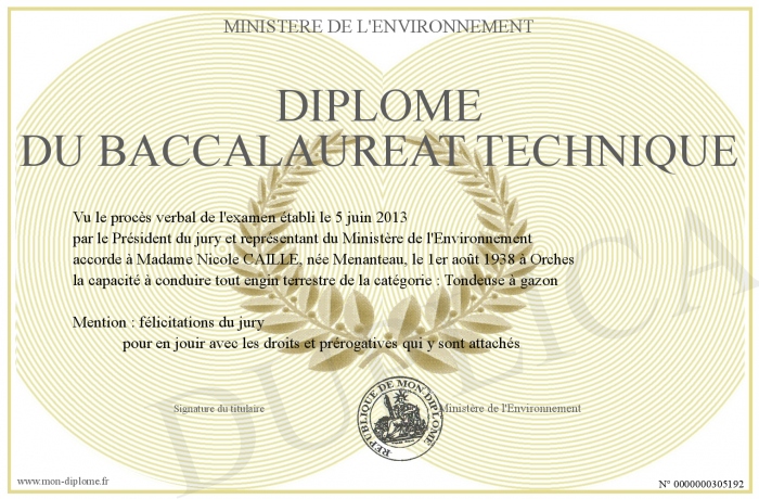 Envoyez par email votre Diplôme du Baccalaureat Technique personalisé