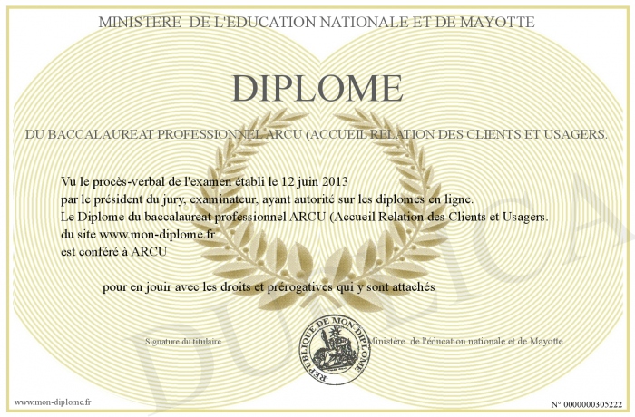 Envoyez par email votre Diplome du baccalaureat professionnel ARCU (Accueil Relation des Clients et Usagers. personalisé
