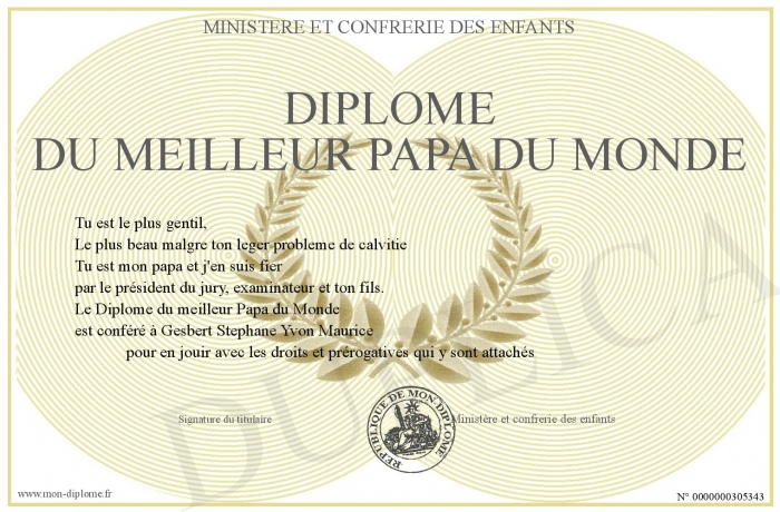 Envoyez par email votre Diplôme du meilleur Papa du Monde personalisé
