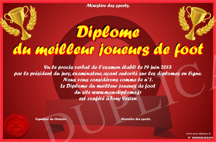 Envoyez par email votre Diplome du meilleur joueurs de foot personalisé