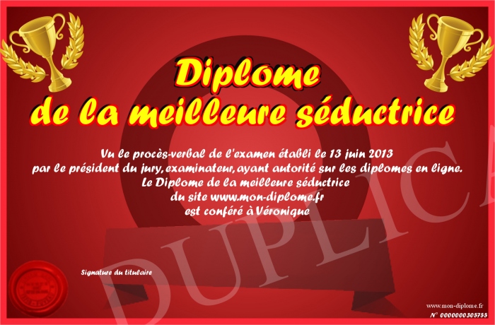 Envoyez par email votre Diplôme de la meilleure séductrice personalisé