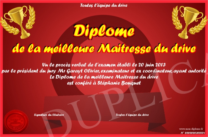 Envoyez par email votre Diplome de la meilleure Maitresse du drive personalisé