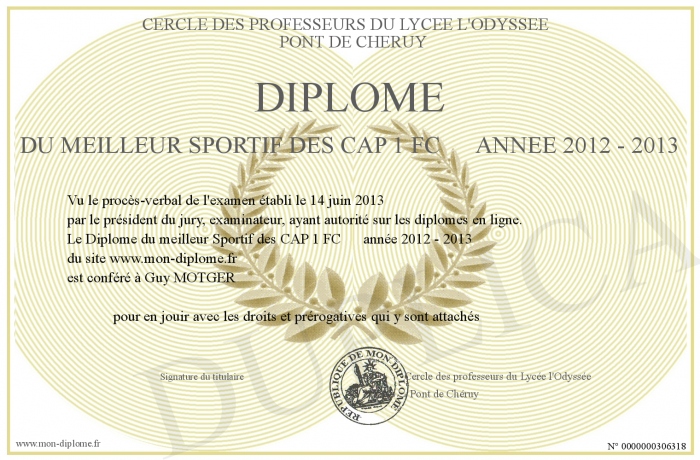 Envoyez par email votre Diplôme du meilleur Sportif des CAP 1 FC année 2012 - 2013 personalisé