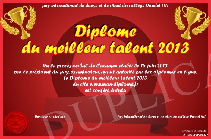 Envoyez par email votre Diplome du meilleur talent 2013 personalisé