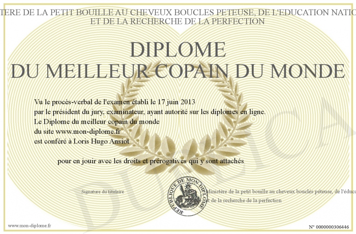 Envoyez par email votre Diplôme du meilleur copain du monde personalisé