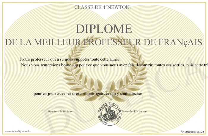 Envoyez par email votre Diplôme de la meilleur professeur de Français personalisé