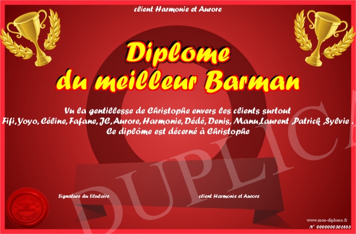 Envoyez par email votre Diplôme du meilleur Barman personalisé