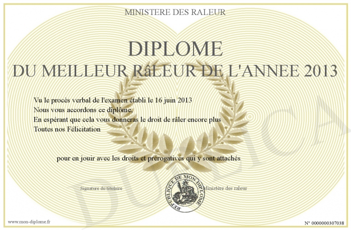 Envoyez par email votre Diplôme du meilleur râleur de l'année 2013 personalisé