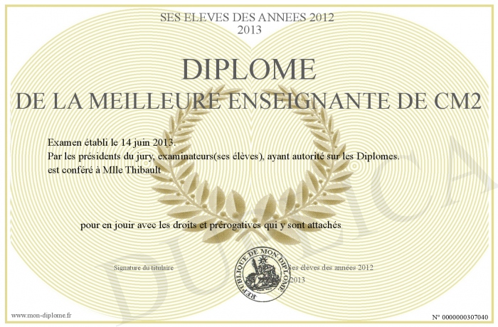Envoyez par email votre Diplôme de la meilleure enseignante de cm2 personalisé