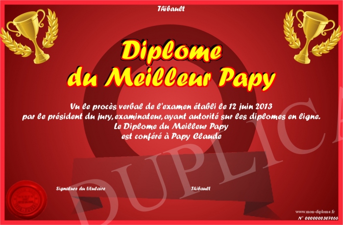 Envoyez par email votre Diplome du Meilleur Papy personalisé