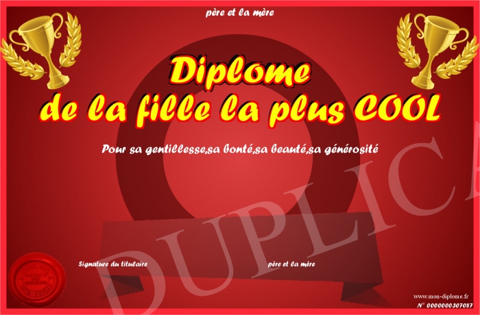 Envoyez par email votre Diplôme de la fille la plus COOL personalisé