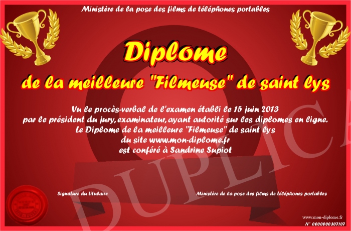 Envoyez par email votre Diplôme de la meilleure -Filmeuse- de saint lys personalisé