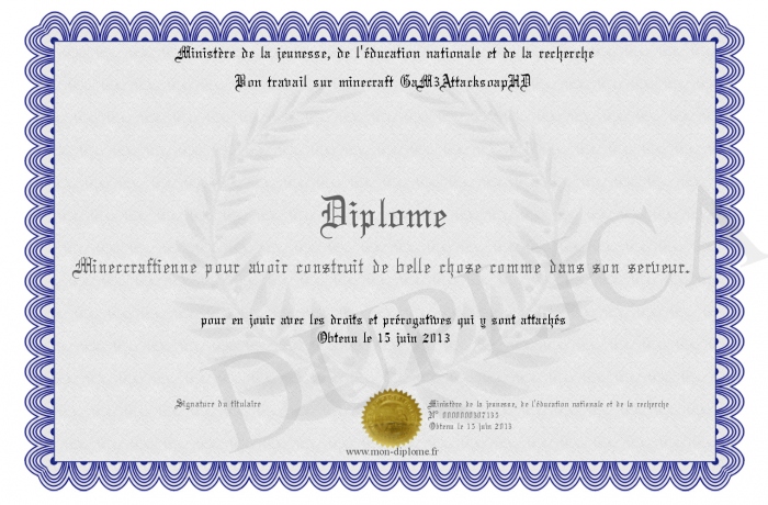 Envoyez par email votre Diplome Mineccraftienne pour avoir construit de belle chose comme dans son serveur. personalisé