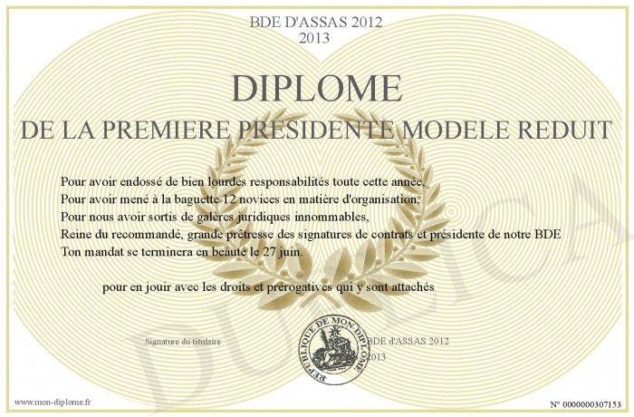 Envoyez par email votre Diplôme de la première présidente modèle réduit personalisé