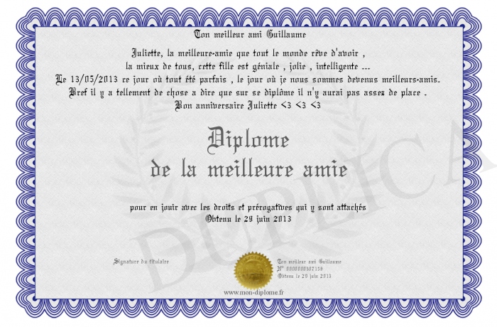 Envoyez par email votre Diplome de la meilleure amie personalisé