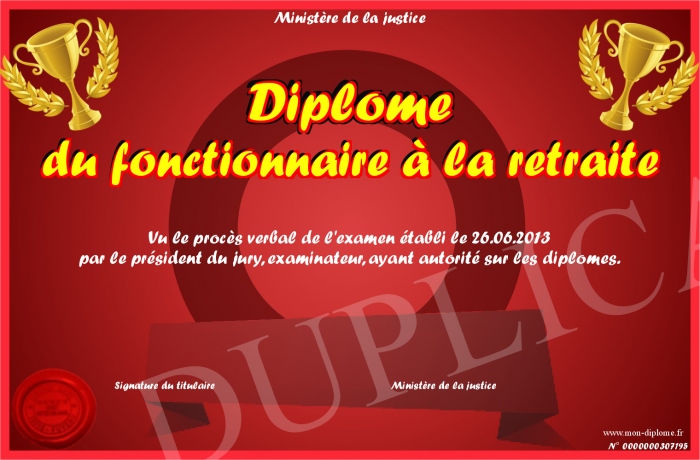 Envoyez par email votre Diplôme du fonctionnaire à la retraite personalisé