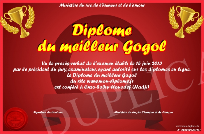 Envoyez par email votre Diplome du meilleur Gogol personalisé