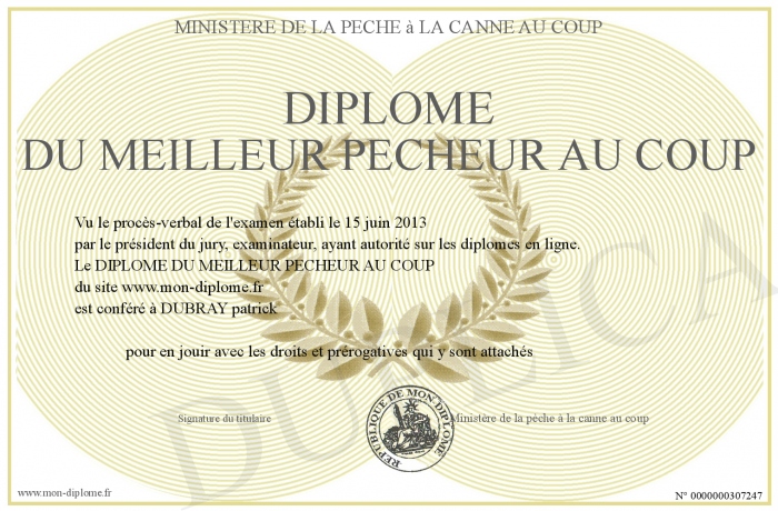 Envoyez par email votre DIPLOME DU MEILLEUR PECHEUR AU COUP personalisé