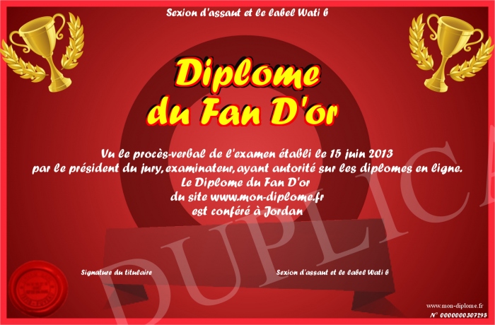 Envoyez par email votre Diplôme du Fan D'or personalisé