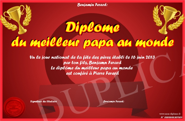 Envoyez par email votre Diplôme du meilleur papa au monde personalisé
