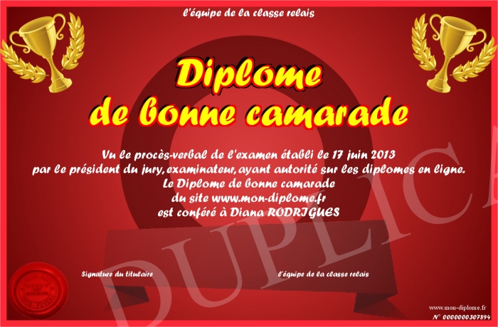 Envoyez par email votre Diplôme de bonne camarade personalisé