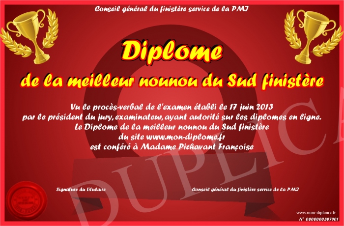 Envoyez par email votre Diplôme de la meilleur nounou du Sud finistère personalisé