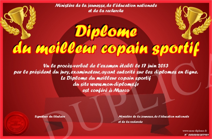 Envoyez par email votre Diplôme du meilleur copain sportif personalisé