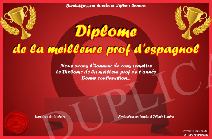 Envoyez par email votre Diplôme de la meilleure prof d'espagnol personalisé