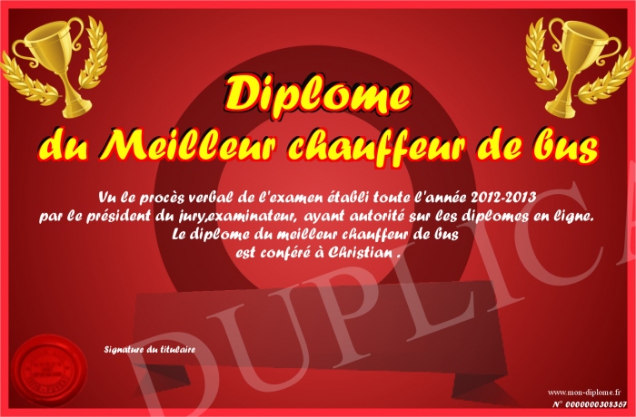 Envoyez par email votre Diplôme du Meilleur chauffeur de bus personalisé