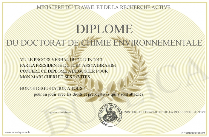 Envoyez par email votre DIPLOME DU DOCTORAT DE CHIMIE ENVIRONNEMENTALE personalisé