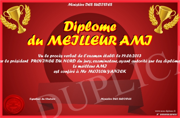 Envoyez par email votre Diplome du MEILLEUR AMI personalisé