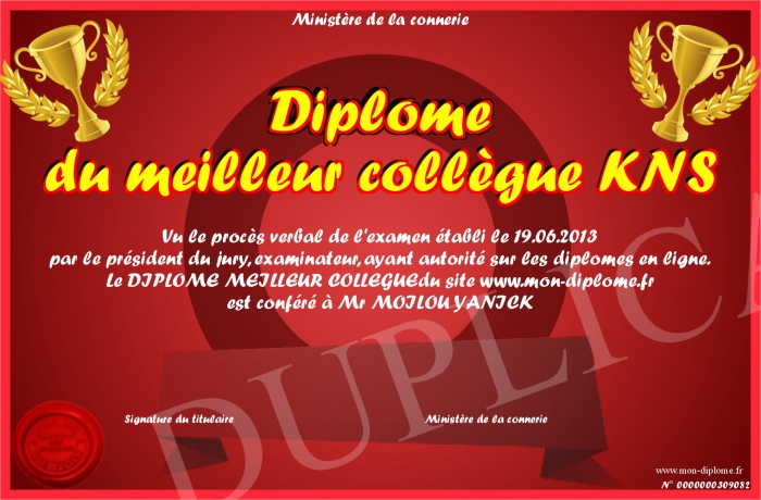 Envoyez par email votre Diplome du meilleur collègue KNS personalisé
