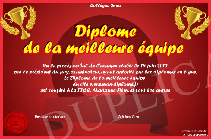 Envoyez par email votre Diplôme de la meilleure équipe personalisé