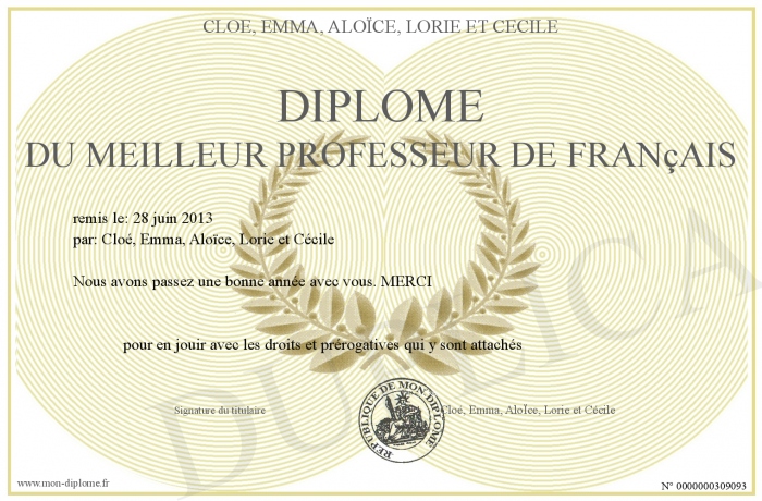 Envoyez par email votre Diplôme du meilleur professeur de français personalisé