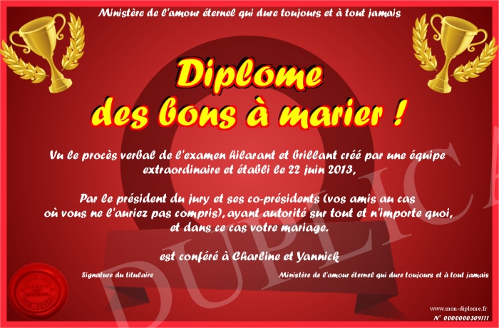 Envoyez par email votre Diplome des bons à marier ! personalisé