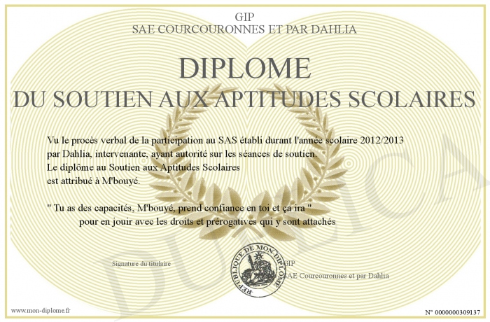Envoyez par email votre Diplôme du Soutien aux Aptitudes Scolaires personalisé